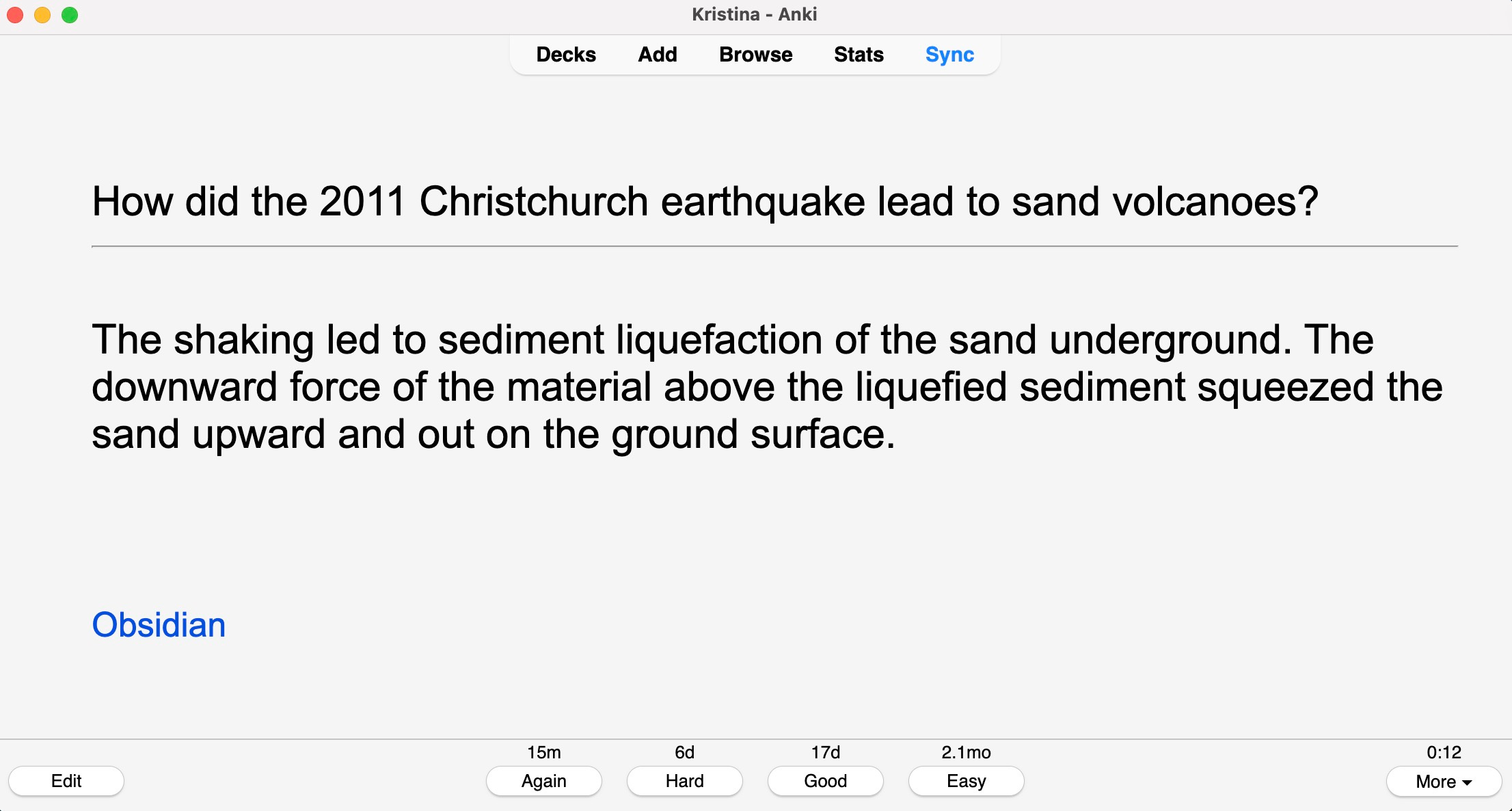 Using the plug-in Obsidian_to_Anki this gets automatically imported into my Geology flashcard deck, so next time I go through my Anki reviews I see this: