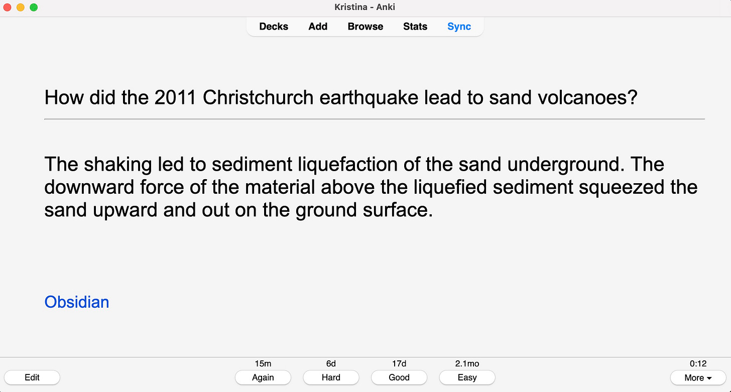(Note that "Obsidian" here is a link to the file that created the card - this can be useful for either finding the context of the question or for making changes to it.)