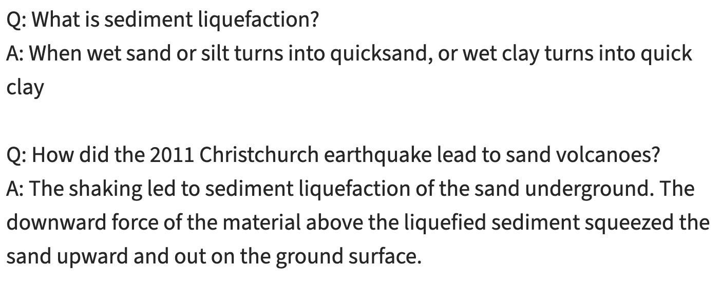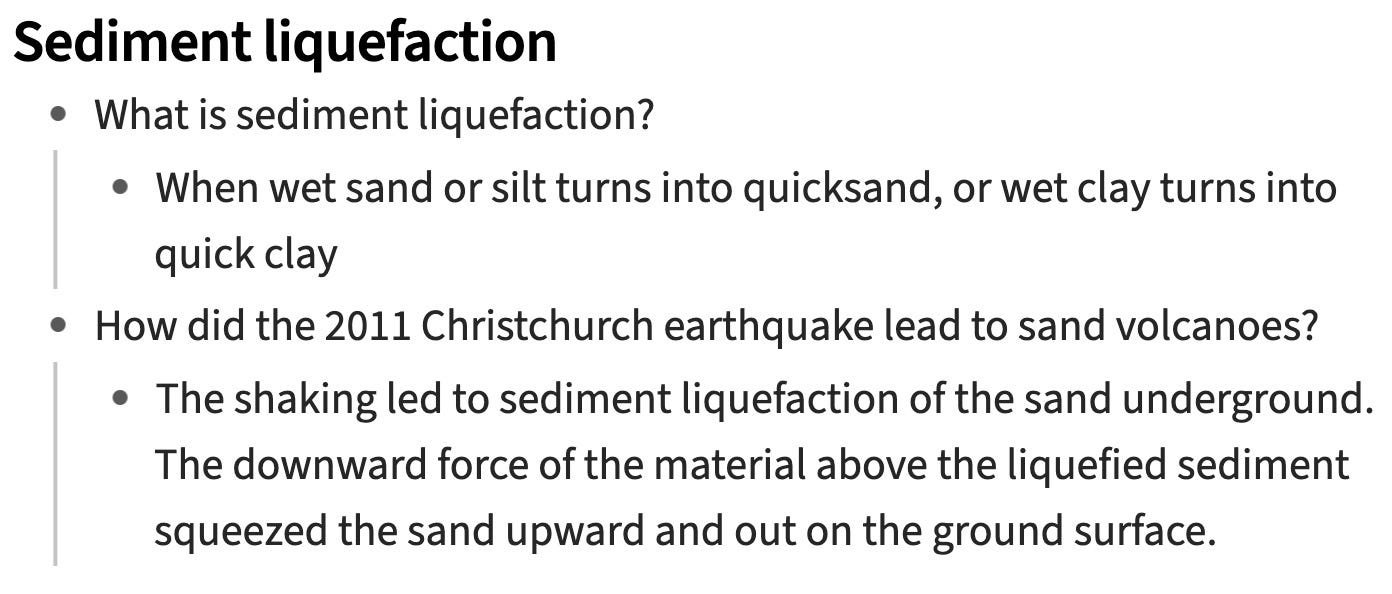 Aside: This is perhaps not the best type of question for a flashcard, since the answer is so long. Ideally, each flashcard would have a single fact on it rather than a sequence of events. However, it is good enough for my purposes on this topic, as I want to learn the whole process leading to sand volcano formation. I have understood it well enough that I can do a quick mental visualisation of what is happening rather than recalling the precise words.
